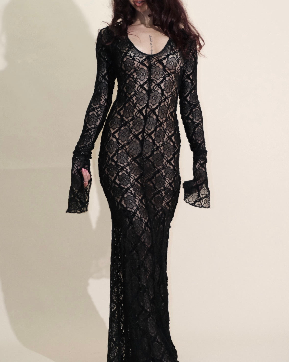 Black Lace Trumpet Dress – Long Sleeve, Deep V-Neck with Collar, Vintage Handmade Occasion Wear Maxi Dress